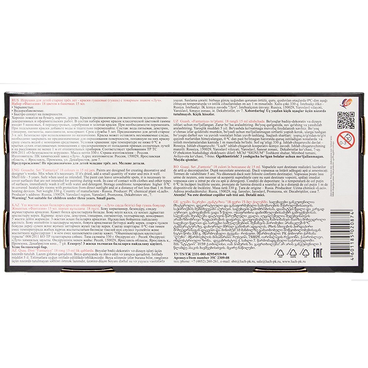 Гуашь «Фантазия» изготовлена на основе натуральных компонентов и высококачественных пигментов. Идеально подходит для работы на бумаге, картоне и дереве. После высыхания сохраняет насыщенность цвета, приобретая бархатистую, матовую поверхность. Рекомендована для детского творчества, художественно-декоративных и оформительских работ.