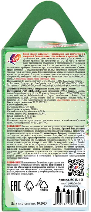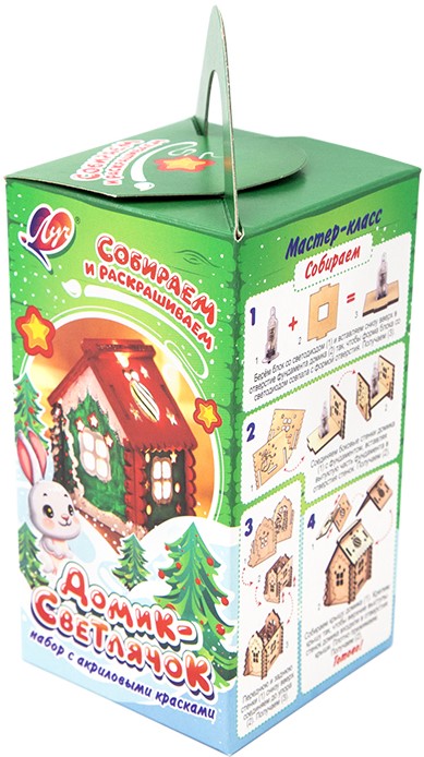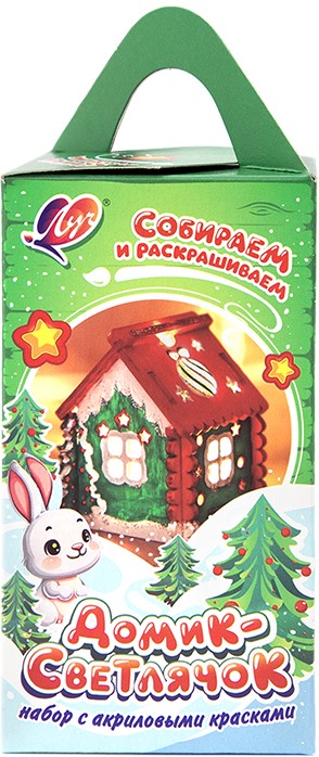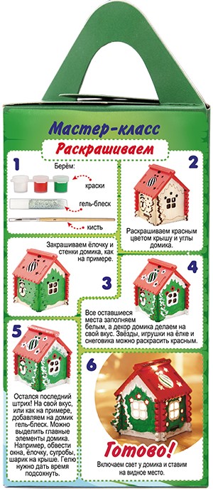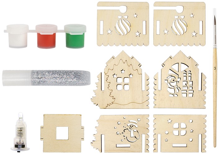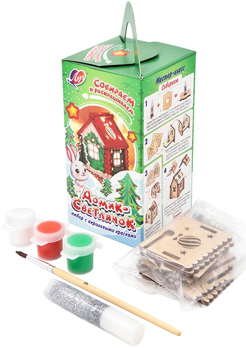 В составе набора: деревянные заготовки для домика, краски акриловые, блок со светодиодами, батарейки, гель с блестками и кисть.