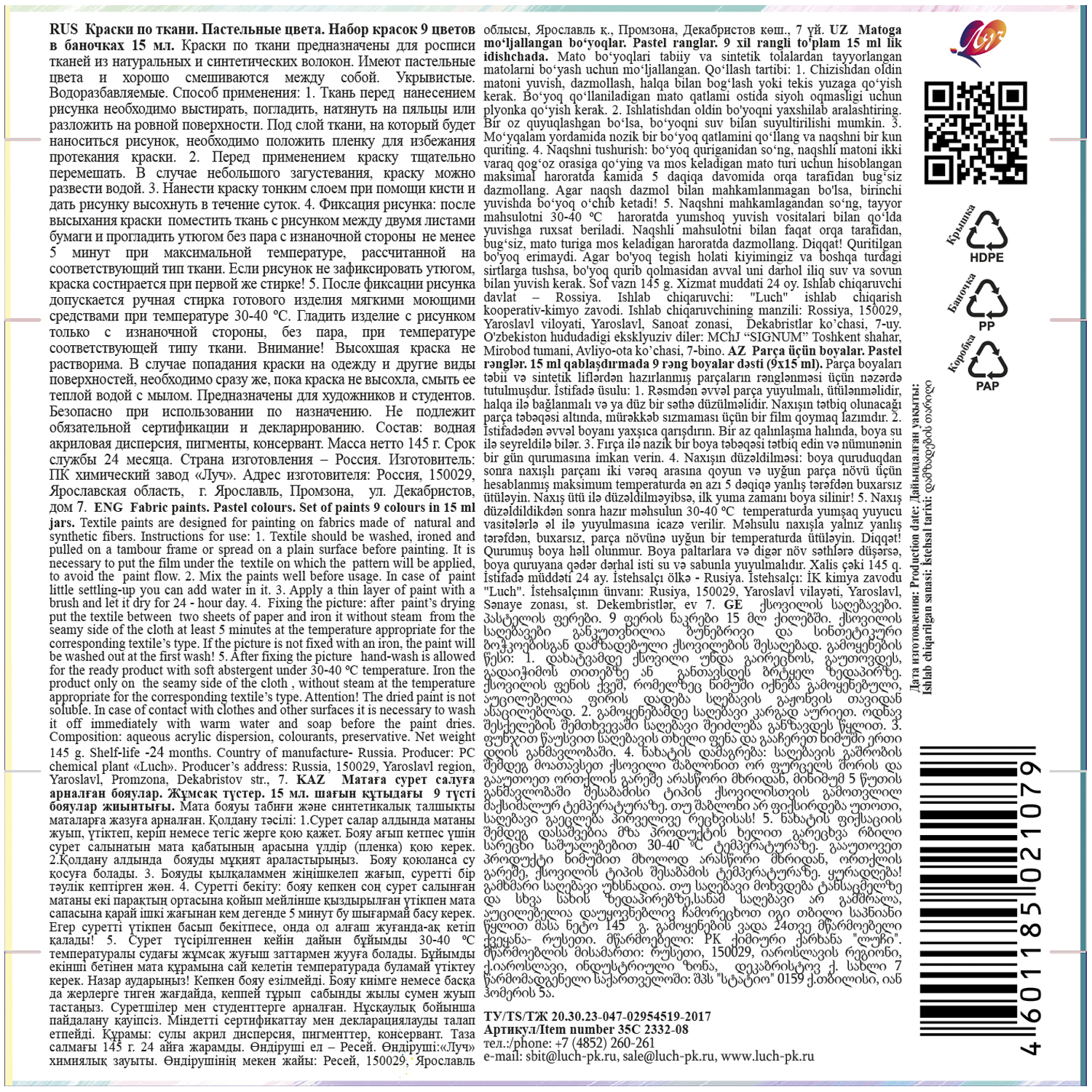 Акриловые краски для декора всех видов тканей — натуральных и синтетических. После термической фиксации утюгом рисунок становится стойким к машинной стирке при температуре до 40°C.