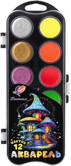Набор акварели "Фантазия" 12 цвето включает в себя 6 неоновых и 6 перламутровых цветов. Краски разлиты в донышко чёрного цвета с европодвесом, прозрачная крышка.
