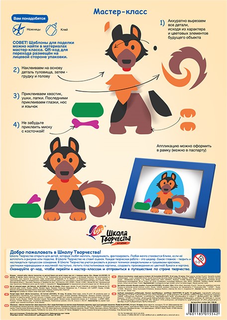 Эксклюзивные видео мастер-классы от опытных педагогов, контуры деталей для поделки Собака — пройти по QR- коду на упаковке.