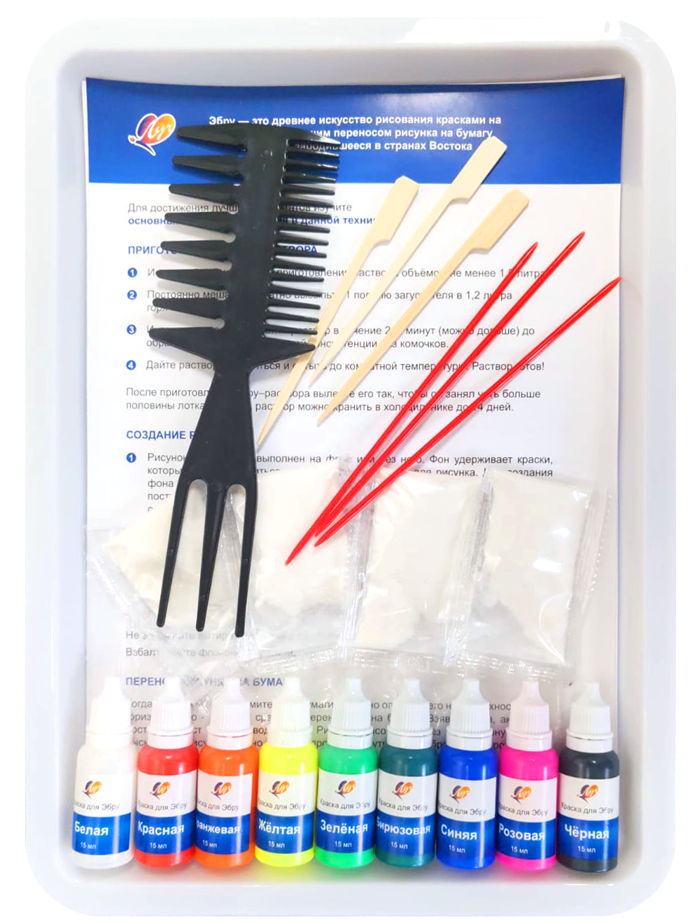 Творческий набор для рисования красками в технике Эбру развивает креативность и фантазию, идеально подходит как для детей, так и для взрослых. ЭБРУ – искусство создания узоров, орнаментов и неповторимых рисунков на поверхности воды с последующим их переносом на бумагу, ткань, гипс и другие шершавые поверхности. Рисование в этой технике развивает мелкую моторику, фантазию, внимание, мышление и воображение. Яркие и насыщенные цвета красок обеспечивают великолепный результат. Цвета легко смешиваются между собой, позволяя создавать новые оттенки. В наборе есть всё необходимое для творческого процесса: