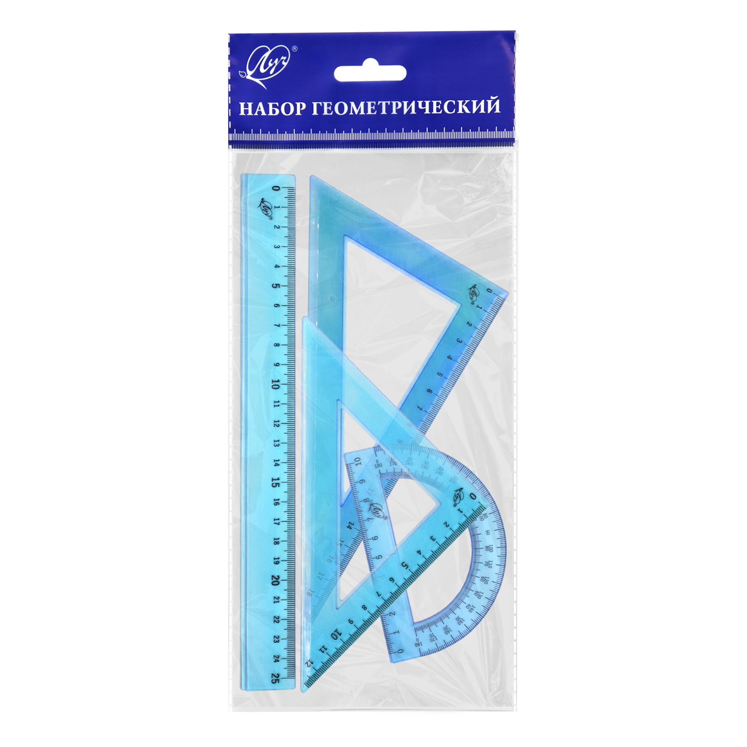В наборе 4 предмета: линейка 25 см, угольник 30°/ 60°, 18 см; угольник 45°/ 45°, 12 см; транспортир 180°, 10 см