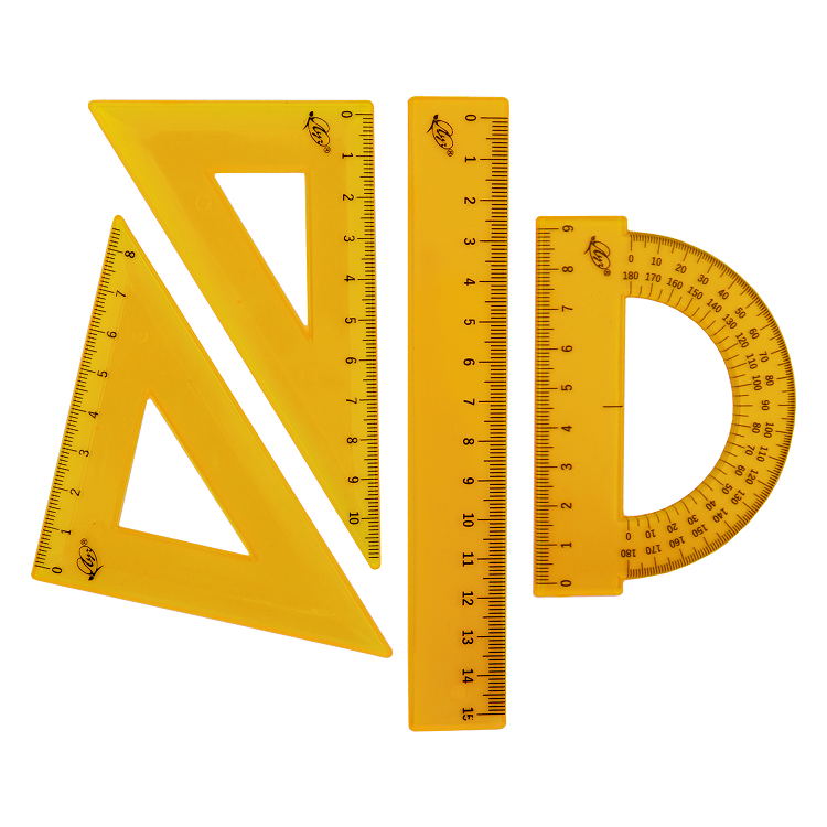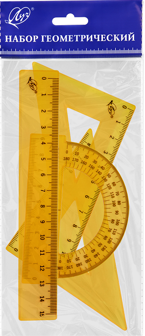 В наборе 4 предмета: линейка 15 см, угольник 30 °/ 60 °, 10 см; угольник 45 °/ 45 °, 8 см; транспортир 180 °, 9 см.