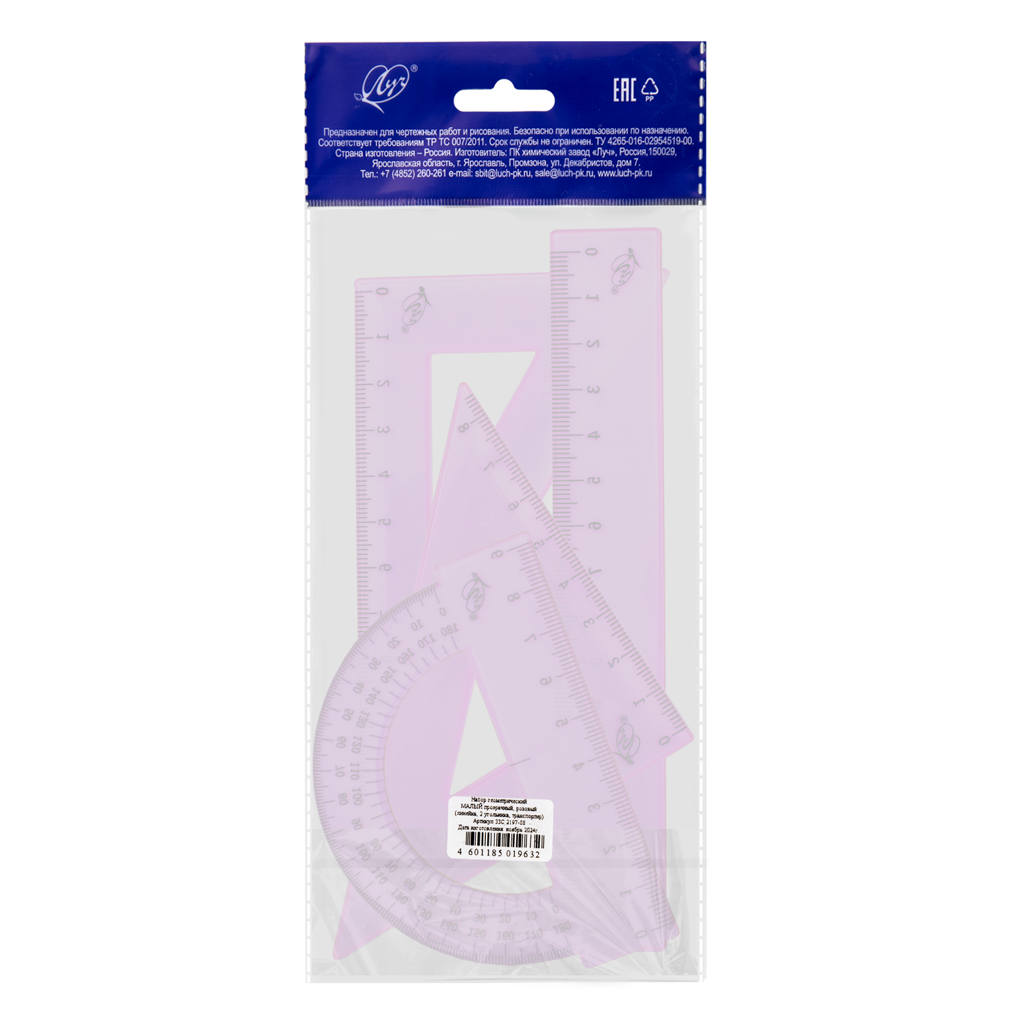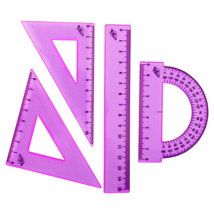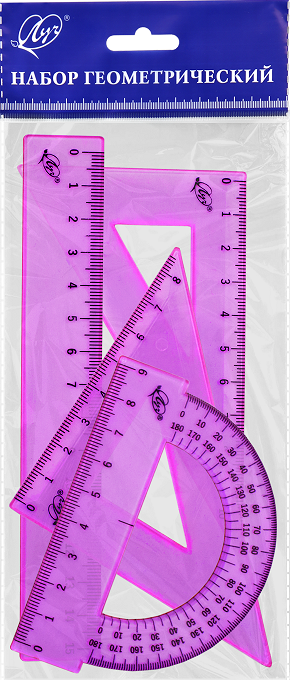 В наборе 4 предмета: линейка 15 см, угольник 30 °/ 60 °, 10 см; угольник 45 °/ 45 °, 8 см; транспортир 180 °, 9 см.