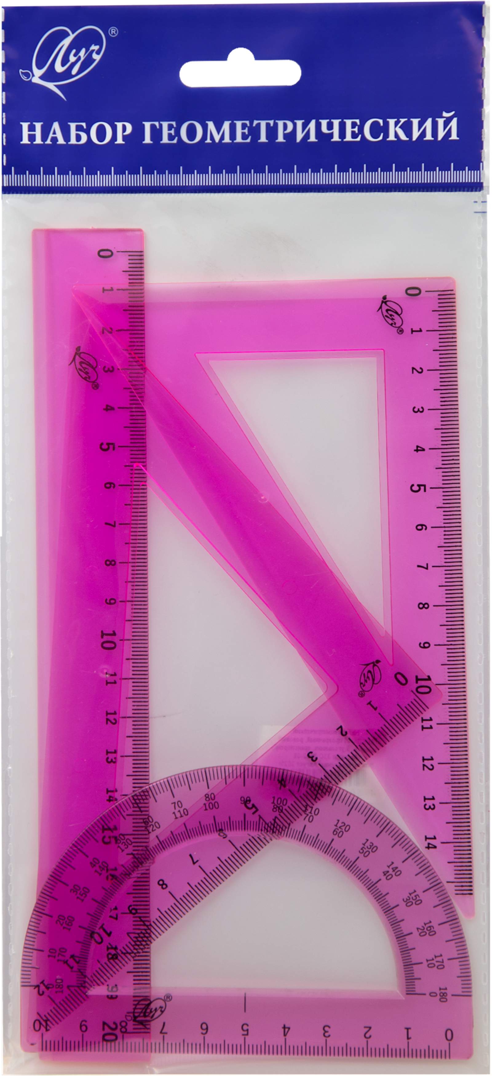 Геометрический набор предназначен школьникам, студентам, сотрудникам офисов - всем, кто работает с чертежами. Линейки изготовлены из высококачественного пластика. Четкая печать односторонней шкалы. Упаковка: прозрачный пакет с подвесом.