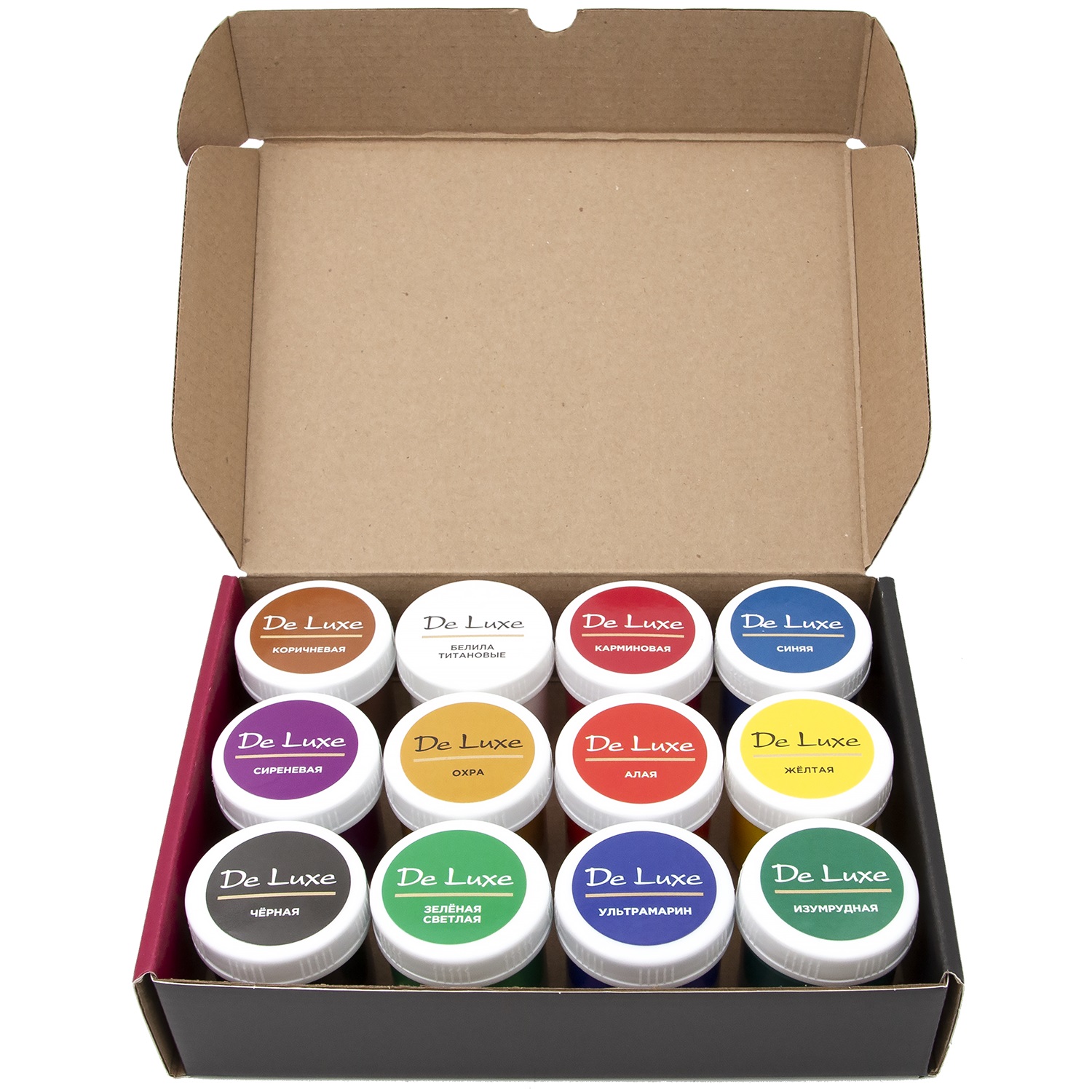 В набор 12 цв. в баночках 40 мл входит: Белила титановые, Желтая, Алая, Зеленая светлая, Ультрамарин, Черная, Синяя, Изумрудная, Коричневая, Карминовая, Охра, Сиреневая.