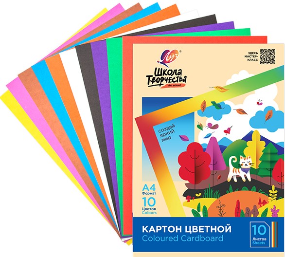 В наборе цветной картон 10 листов, 10 цветов: белый, жёлтый, оранжевый, красный, зелёный, светло-синий, фиолетовый, фуксия, коричневый, чёрный.
