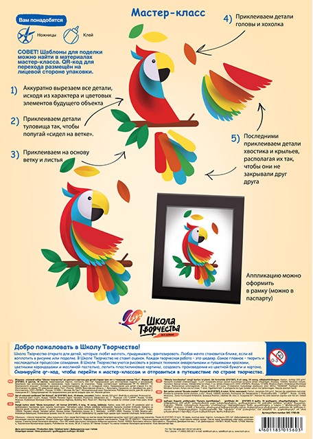 Эксклюзивные видео мастер-классы от опытных педагогов, контуры деталей для поделки Попугай — пройти по QR- коду на упаковке.