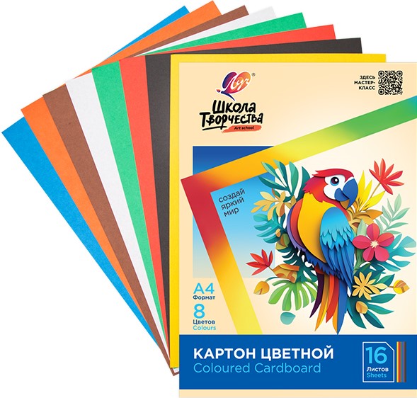 В наборе цветной картон 16 листов 8 цветов: белый, жёлтый, оранжевый, красный, зелёный, светло-синий, коричневый, чёрный.
