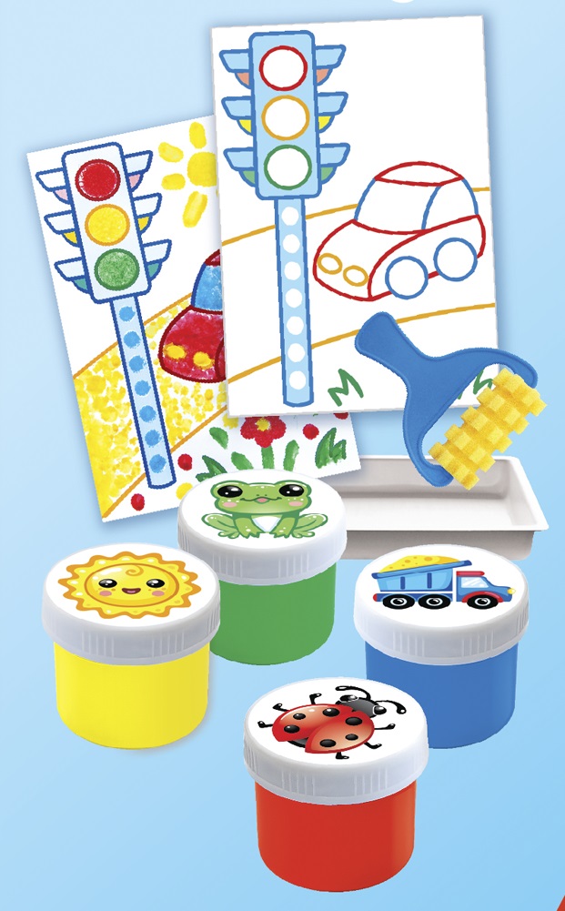 Состав набора: 4 герметичные баночки с краской ёмкостью 40 мл. (жёлтый,синий, красный, зелёный), фигурный роллер - 1 шт., лоток для рисования, раскраски - 4 шт. В подарок - спонжик на пластмассовой ручке.