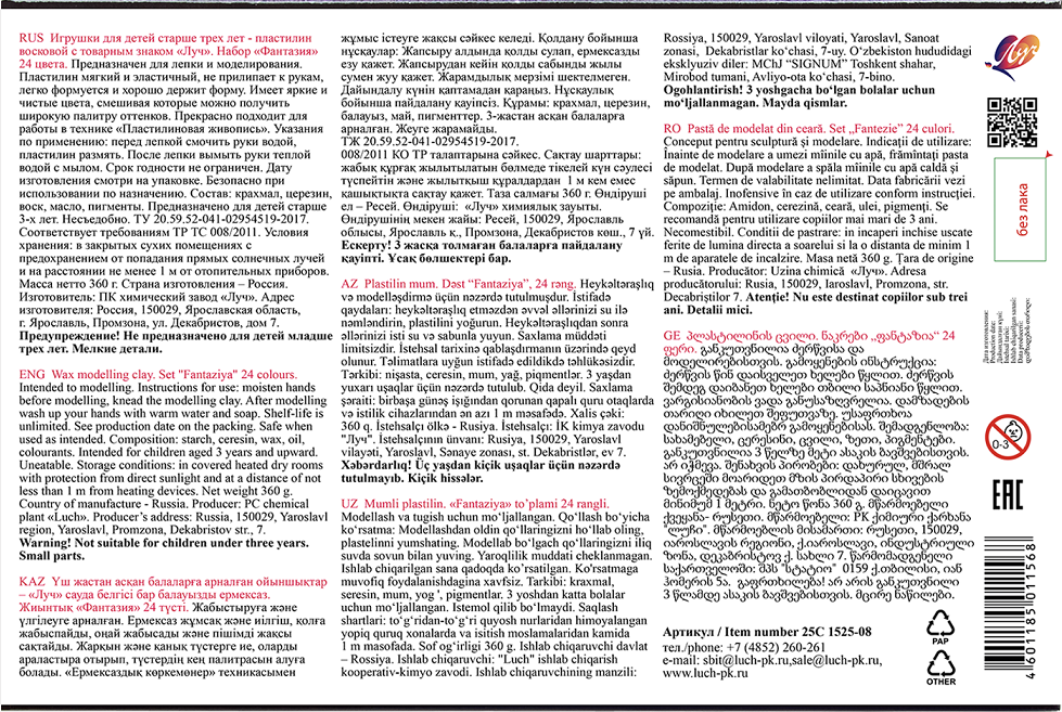 Восковой пластилин «Фантазия» подойдёт для творческих занятий людям любого возраста. Благодаря специально разработанной рецептуре он мягче и эластичнее классического пластилина, легко разминается и сразу готов к работе. При этом сохраняет все основные свойства классического материала. Им удобно лепить, рисовать по бумаге и картону, а готовые объёмные фигурки отлично держат форму.
