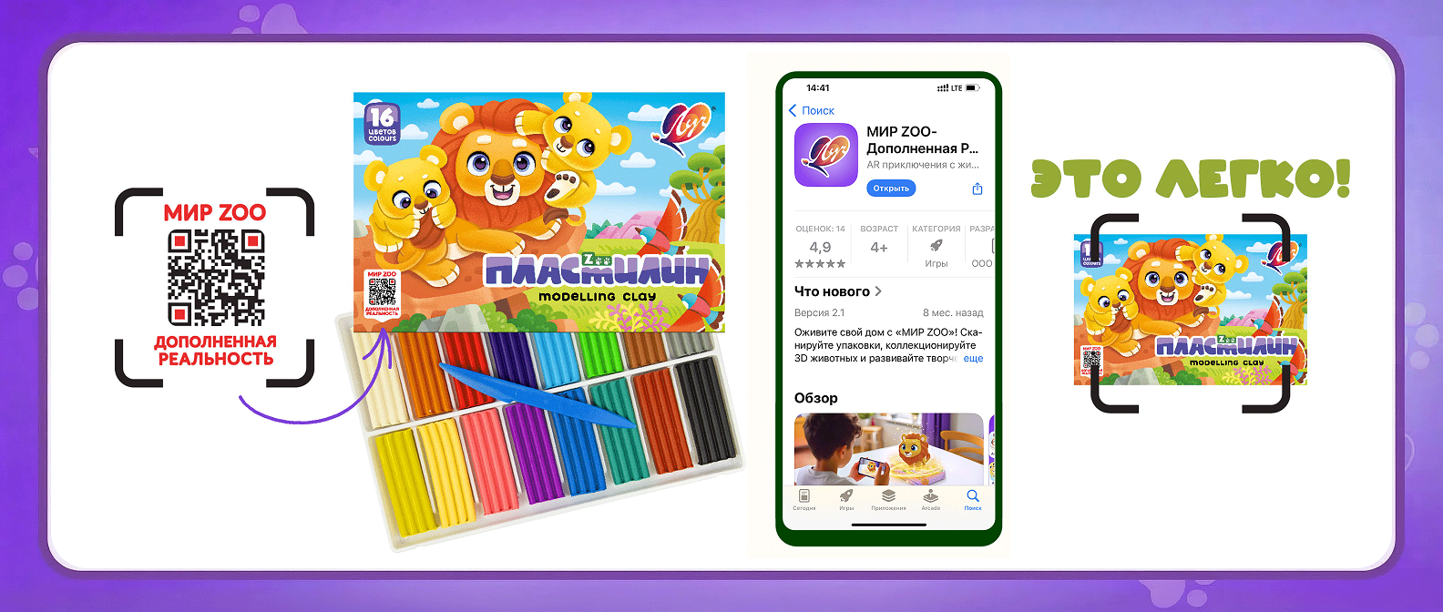 Отсканируйте куар-код, расположенный на упаковке продукции серии ZOO, и установите бесплатное обучающее приложение «Мир ZOO» на смартфон или планшет.