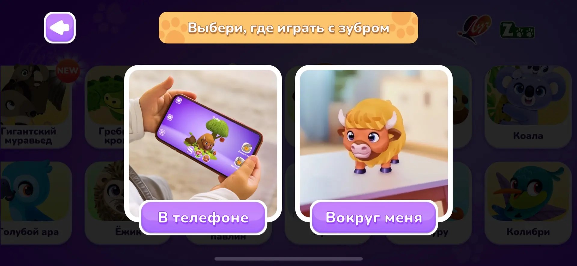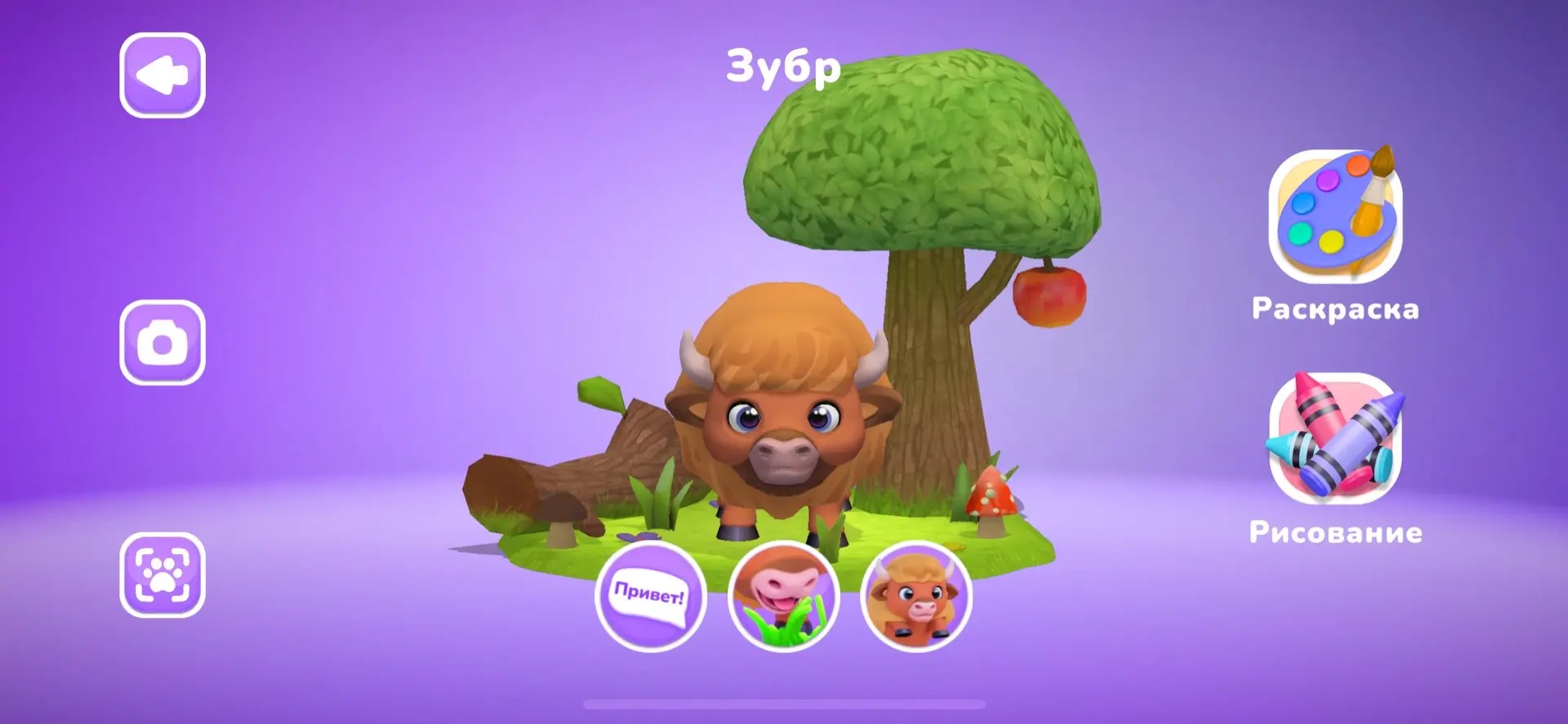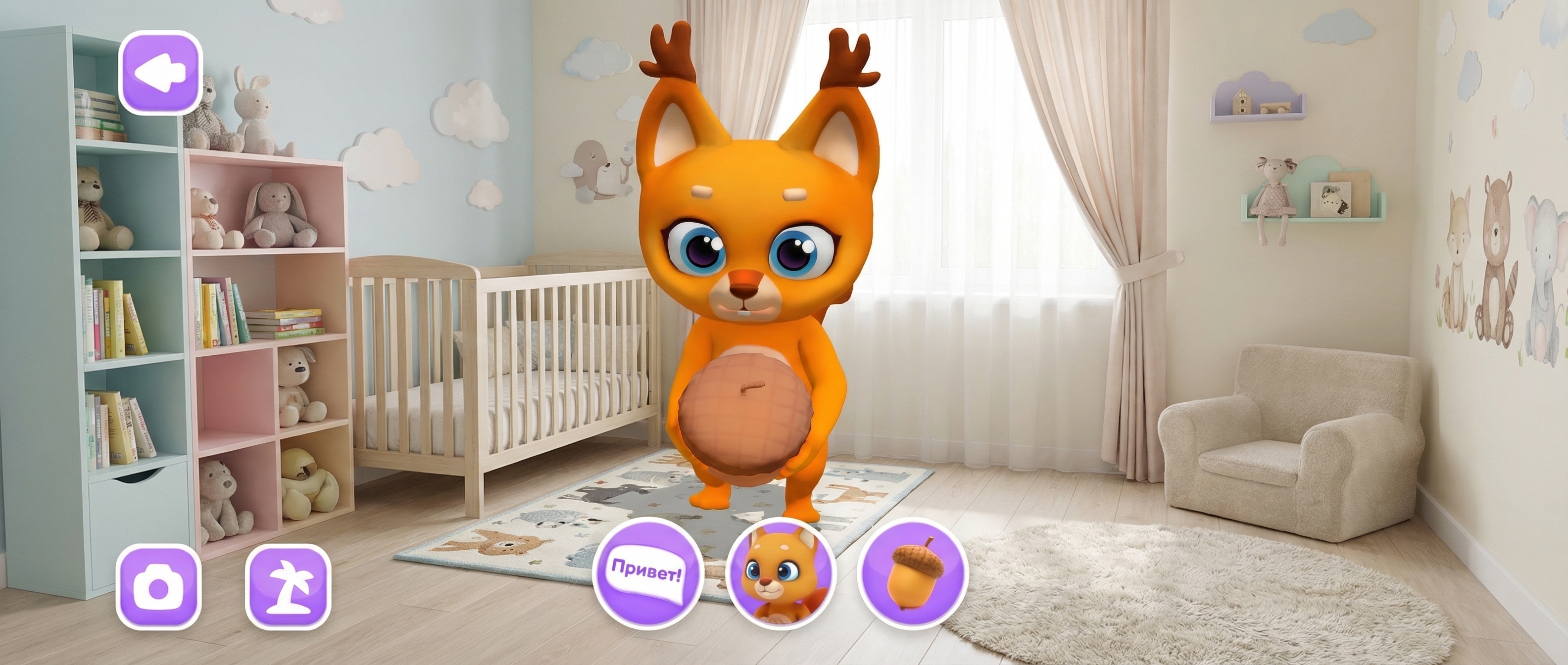 Режим «В телефоне»: персонаж появляется на экране без привязки к упаковке. На экране доступны интерактивные кнопки, управляющие действиями героя: нажмите на одну — и животное расскажет о себе, на другую — издаст забавный звук, на третью — выполнит забавное движение. Персонажа можно поворачивать, рассматривать со всех сторон и фотографировать.