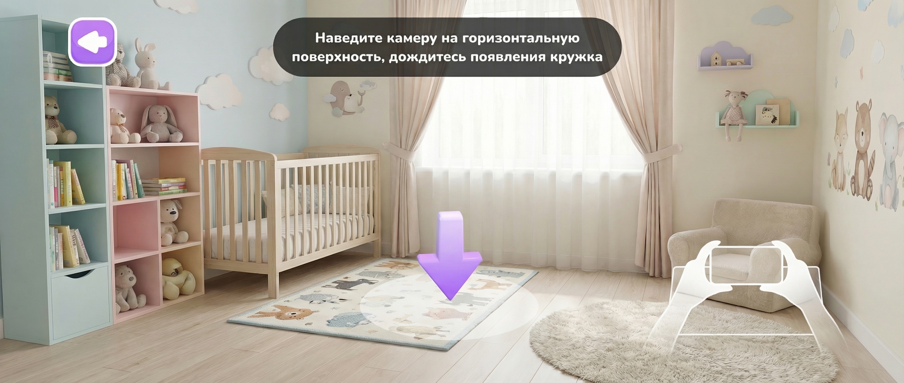 Режим «Вокруг меня»: персонаж встраивается в реальное пространство через камеру. Упаковка не нужна — животное появляется прямо в комнате. Его можно уменьшать, увеличивать, поворачивать и фотографировать с разных ракурсов.
